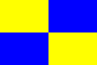 It is a fairly typical Portuguese municipal flag, with the coat of arms centred on a field quartered of yellow and blue.