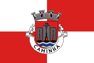 The arms are Gules three towers Argent masoned Sable with port and windows Gules and the middle one higher and roofed and bearing a carved coat of arms and a clock, each tower on one of three islets Sable issuant from a base wavy Argent charged with a fess wavy Azure. Mural crown argent with four visible towers (town rank) and white scroll reading in black upper case letters "CAMINHA".