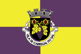 The arms are Sable a bunch of grapes Purpure leafed and trunked Or and two pomegranates Or seeded Gules. Mural crown argent with four visible towers (town rank) and white scroll reading in black upper case letters "VILA DE CARREGAL DO SAL".