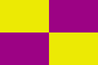 It is a fairly typical Portuguese municipal flag, with the coat of arms centred on background quarterly (town rank), yellow and purple.