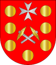 The arms are Gules two picks Or hafts downward Argent crossed per saltire, in central chief a Maltese cross and seven bezants all in orle. Mural crown Argent with four visible towers (town rank) and white scroll reading "GÁFETE - CRATO" in black upper case letters.