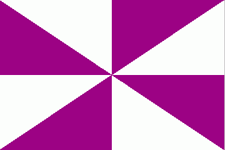 It is a fairly typical Portuguese municipal flag, with the coat of arms centred on a field gyronny (meaning city rank) of purple and white.