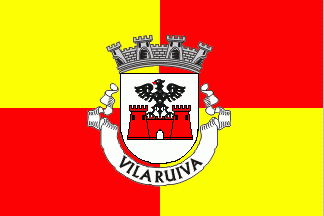 Shield Argent, an eagle Sable, semy of plates and tongued Gules, placed upon an embattled wall Gules, flanked by two embattled towers of the same with windows Sable and port Argent. Mural crown Argent with four visible towers (town rank) and white scroll reading "VILA RUIVA" in black upper case letters.