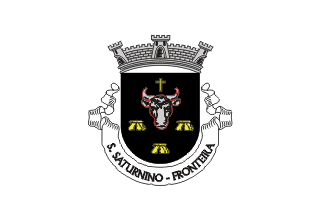 The arms are Sable a bull's head caboshed Argent emphasized Sable and fimbriated Gules (!) between three dolmens set 2+1 in the base, in chief a Latin cross diminute Or. Mural crown Argent with three visible towers (village rank) and white scroll reading in black upper case letters "SÃO SATURNINO - FRONTEIRA".