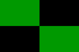 It is a fairly typical Portuguese municipal flag, with the coat of arms centred on a field quartered of green and black.