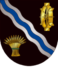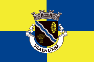 The arms are Sable flanking a bend wavy Argent charged with a bend wavy Azure an eight-spoked watermill wheel Or in chief sinister and a sheaf of wheat Or tied Vert in point dexter. Mural crown argent with four visible towers (town rank) and white scroll reading in black upper case letters scroll reading in black upper case letters "VILA DA LOUSÃ".