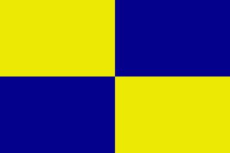 It is a fairly typical Portuguese municipal flag, with the coat of arms centred on a yellow and blue quarterly (town rank) background.
