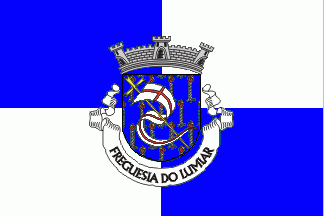 Shield Azure semy of candles Argent flamed Gules and Or, over all a bendy baston bendy Or topped by a cross and fixing a white pennant (flamula) bearing an off-centred throughout cross. Mural crown Argent with three visible towers (village rank) and white scroll reading in black upper case letters"FREGUESIA DO LUMIAR".