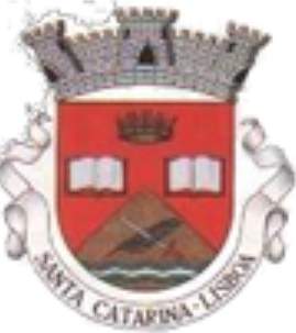 Shield Gules over a base wavy of Vert and Argent, a mountain proper (i.e. brown) issuant superimposed by a pen Sable and a sword Argent hilted Gules, both crossed per saltire, above two couped open books Argent and in chief a couped coronet Proper. Mural crown Argent with three visible towers (village rank) and white scroll reading in black upper case letters "SANTA CATARINA - LISBOA".