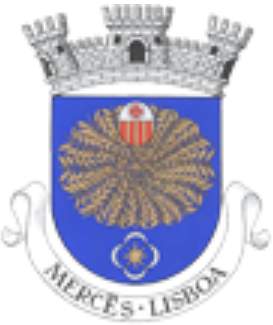 Shield Azure, the central charge is Or, either a wheel of wheat ears or leaves or feathers, in central chief superimposed by an oval inescutcheon bearing the Aragonese arms with a chief Argent, where at least a red cross is recognizable, in base a sun Or (or an 8-point star) in the centre of a lunel Argent. Mural crown Argent with three visible towers (village rank) and white scroll reading in black upper case letters "MERCÊS - LISBOA".