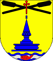 Shield Or, a water supply well Azure, in chief two crossed oars Sable superimposed in the middle by a small sword Gules, base wavy of Azure and Argent, superimposed by a fish red. Mural crown Argent with three visible towers (village rank) and white scroll reading in black upper case letters