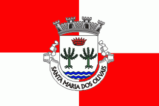Shield Argent over a base wavy of Azure and Argent, two olive trees eradicated Vert, in central chief a royal coronet Gules. Mural crown Argent with four visible towers (town rank) and white scroll reading "SANTA MARIA DOS OLIVAIS - LISBOA" in black upper case letters.