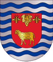 The arms are Gules a lamb passant Or and on the chief a bunch of grapes