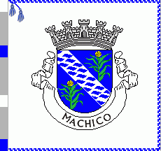 legal prescription, with green on blue.). Mural crown argent with five visible towers (city rank) and white scroll reading in black upper case letters "MACHICO".