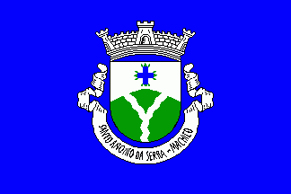 It is a fairly typical Portuguese communal flag, with the coat of arms centred on a plain blue background (village rank).