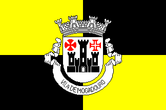 The arms are argent, a castle sable with port and windows argent, a templar cross in the dexter chief and a Christ Order cross in the sinister. Mural crown with four towers and white scroll reading "VILA DE MOGADOURO" in black capitals.