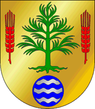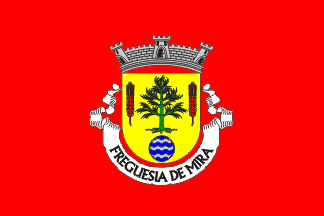 The arms are Or a pine tree Vert eradicated of the same flanked by two ears of wheat Gules and in base a heraldic fountain. Mural crown argent with three visible towers (village rank) and white scroll reading in black upper case letters "FREGUESIA DE MIRA".