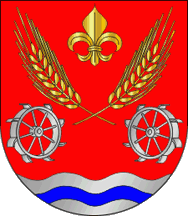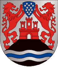 wavy fess Argent a castle Gules under an escutcheon Azure charged with 13