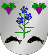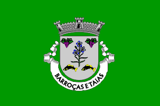 The arms are Argent a flax plant Vert flowering Azure and in chief two bunches of grapes Purpure lieved Vert and in base two trouts embowed Sable garnished Or set in fess. Mural crown argent with three visible towers (commune rank) and white scroll reading in black upper case letters "Barroças e Taias". Original blazon: