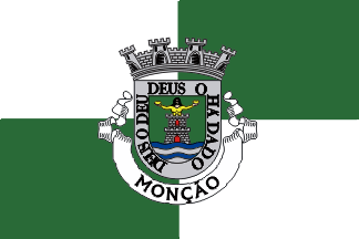 and white scroll reading in black upper case letters "Monção".