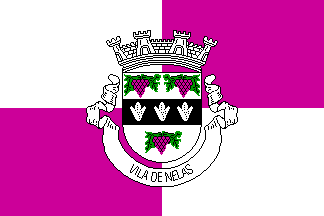 The coat of arms is argent around a fess sable changed with three maize ears argent set in pale three bunches of grapes fruited purpure and leaved and stemmed vert. Mural crown argent with four visible towers (town rank) and white scroll reading in black upper case letters "Vila de Nelas".