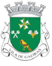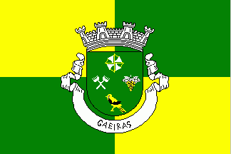 Shield Vert, four charges set in cross, in central chief a windmill's wheel Or rigged Argent, at dexter a pair of forks (or mattocks) Argent crossed per saltire, at sinister a bunch of grapes Or leaved Argent, in base a bird Or garnished Sable, perhaps an oriole. Mural crown Argent (town rank) with four visible towers and white scroll reading in black upper case letters "VILA DE GAEIRAS" or simply, as on flag, "GAEIRAS