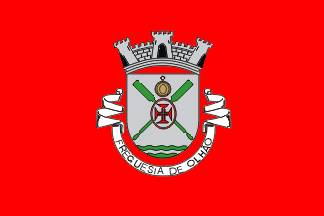 On a silver field, 2 green oars crossed per saltire charged with a silver red fringed oval medallion with the Order of Christ cross, on top a gold Restoration medal, below 2 green waves. Mural crown with 3 silver towers and a white scroll with the words in black "FREGUESIA DE OLHÃO".