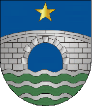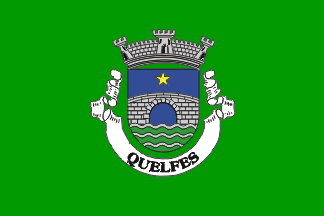 Shield Azure, a 1-arched, throughout bridge Argent masoned Sable over a base wavy of Argent and Vert, in central chief a 5-point star Or. Mural crown with three visible towers (village rank) and white scroll reading in black upper case letters "QUELFES".