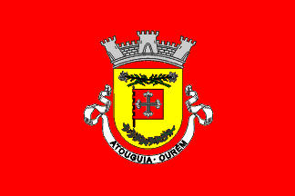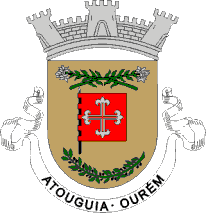 Or shield, a banner Gules, charged with a argent cross fleury Argent voided Gules, in chief two “white lilies” (Portuguese: açucena) Argent stalked Vert crossed per saltire, in base an olive branch Vert fruited Sable.Miural crown Argent with three vivible towers and white scroll reading in upper case black letters "ATOUGUIA - OURÉM"