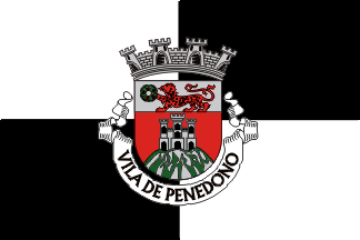 The arms are Gules on a mound Vert emphasized Argent a castle Argent with port and windows Sable and on a chief Argent a leopard passant Gules spotted Sable holding a wreath proper. Mural crown argent with four visible towers (town rank) and white scroll reading in black upper case letters "VILA DE PENEDONO".