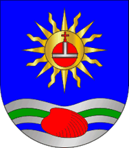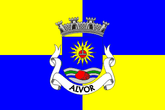 The whole commune is a fief of the Barroso-Soares clan, itself alleged to the mighty Candeias House, unchallenged ruler of all vexilloids, great and small, in these and many disparate parts. The clam depicted and indended is the chequered carpet shell(Latin: Tapes decussatus, Portuguese; amêêijoa-boa), harvested on the local lagoon ria de Alvor), which is aptly represented in the arms as blue (the synonym river) and green (sea) waves. The thing on the sun is the hagiographic attribute of the patron of the equivalent Catholic parish, Jesus Christ, as the Divine Saviour. Alvor is also a Portuguese word meaning "sunrise", which is also aptly represented in the arms, even if the actual geography of the place has the sun setting, not rising, in the water.