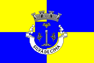 The arms are Azure a column Argent between two twigs of olive Or fruited Argent and in chief a bunch of grapes Argent leaved Or. Mural crown Argent with four visible towers (town rank) and white scroll reading in black upper case letters "SILÃ DE CIMA".
