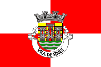 Armas - Escudo xadrezado de ouro e de vermelho, de três peças em faixa e cinco em pala, as de vermelho carregadas de dois filetes de prata postos em faixa. Castelo de prata realçado de negro, aberto e iluminado de vermelho, com a torre central carregada pela cruz da Ordem de Santiago de vermelho, assente o castelo num mar de seis faixetas ondadas, três de verde e três de prata. Coroa mural de prata de cinco torres. Listel branco com a legenda a negro: "SINES".From the official journal Diário da República (III série) of 1997.11.13, registering the arms modified to reflect the status change, as Sines become a city in 1997.06.06. The previous arms were published in the official journal Diário do Governo (I série) of 1936.10.28 (with town status attributes, i.e., four towers in the crown and quartered flag), and the official blazon was only slightly different: