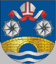 The arms are blue, a bridge gold on a fess wavy argent and blue, under two windmill wheels, sailed argent and “roped” gold, in chief, a bishop tiara argent lined red.""