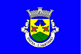 The arms are Or, two camellias Gules leaved Vert ordered per fess, in between a cape Azure torn and open, in base a triple mount Vert issuant. Mural crown argent with three visible towers (village rank) and white scroll reading in black upper case letters "SINTRA - S. MARTINHO"