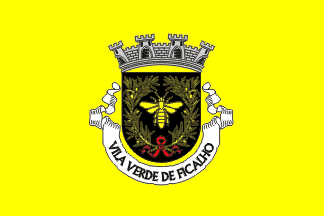 The arms are Sable a bee Or between two olive branches Or crossed at the base and tied Gules. Mural crown Argent with four visible towers (town rank) and white scroll reading in black upper case letters "VILA VERDE DE FICALHO".