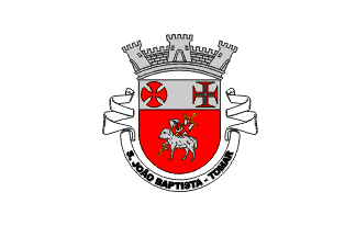 Gules field, argent Paschal Lamb; argent chief, charged with a gules cross patty (cross patty) and a gules cross voided argent . Argent 3 towers mural crown (village rank). White scroll reading in black upper case letters "S. JOÃO BAPTISTA - TOMAR".