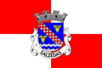 The arms are Azure a bend chequy of three orders Argent and Gules between two bunches of grapes Or and overall a base wavy Argent charged with a barrulet wavy Azure. Mural crown Argent with four visible towers (town rank) and white scroll reading in black upper case letters "SALZEDAS".