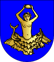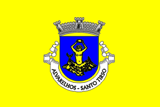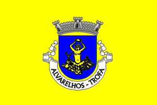 The arms are Azure a nereid ( a kind of mermaid, a daughter of ancient Greek God Nereus) Or. Mural crown Argent with three visible towers (village rank) and white scroll reading in black upper case letters "ALVARELHOS - TROFA".