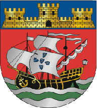 The shield is gules, on a sea of three waves, azure and argent (usually it would be vert and argent, for blue stands for rivers, not see…), a gallion or, draped argent and bearing on the main sail a cross of five eschuteons azure, each charged with a saltire of bezants argent. And on a chief azure a castle or (canting arms, as "castelo" means "castle"). Mural crown argent with five visible towers (city rank) and white scroll reading "CIDADE DE VIANA DO CASTELO" in black upper case letters.