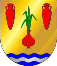 The arms are Or two roman amphoras Gules and an onion Gules leaved Vert all set two and one and on a base wavy Azure a barrulet wavy Argent. Mural crown argent with three visible towers (village rank) and white scroll reading in black upper case letters "ROIOS".