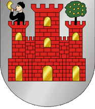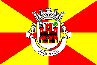 The arms argent, a castle gules, with port and windowa or, with a hornblower blowing or, dressed sable, headdressed argent and of complexion of the same, on top of the dexter tower, and an apple tree vert, fructed or, stemmed sable, on the sinister tower. Mural crown of five towers (city rank) and white scroll reading "CIDADE DE VISEU" in black capitals.