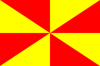 The flag is gyronny red and yellow (city rank), with the municipal coat of arms in the centre.