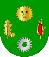 The arms are Vert a sun Or and a cogwheel Argent and an oak twig Or and an corn cob Or fruited Gules all set in cross. Mural crown Argent with three visible towers (village rank) and white scroll reading in black upper case letters "ABRAVESES".