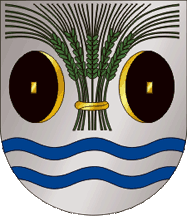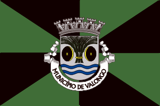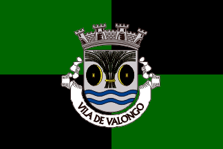 The arms are Argent between two mill millwheels Sable emphasized Or and above two fesses wavy Azure, a sheaf of five wheat ears Vert tied Or. Mural crown Argent with five visible towers (city rank) and white scroll reading in black upper case letters "MUNICíPIO DE VALONGO"