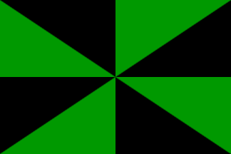It is a fairly typical Portuguese municipal flag, with the coat of arms centred on a black and green gyronny (city rank) field.