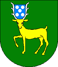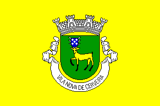 The arms are vert, a stag or crowned with an inescutcheon charged with five bezants argent set in quincunx. Mural crown argent with four visible towers (town rank) and white scroll reading in black upper case letters "VILA NOVA DE CERVEIRA".