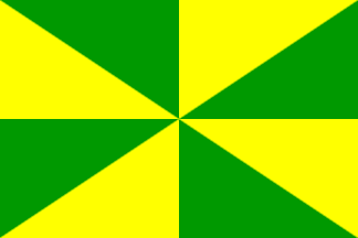 It is a fairly typical Portuguese municipal flag, with the coat of arms centred on a field gyronny (meaning city rank) of green and yellow.