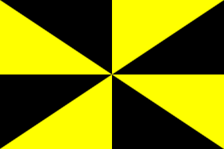 It is a fairly typical Portuguese municipal flag, with the coat of arms centred on a black and yellow gyronny field (city rank).