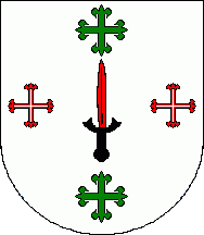 The knife is an attribute of St. Bartholomew, the local patron saint. The two green crosses refer to the Avis Order and the red ones to the Christ Knights' Order.